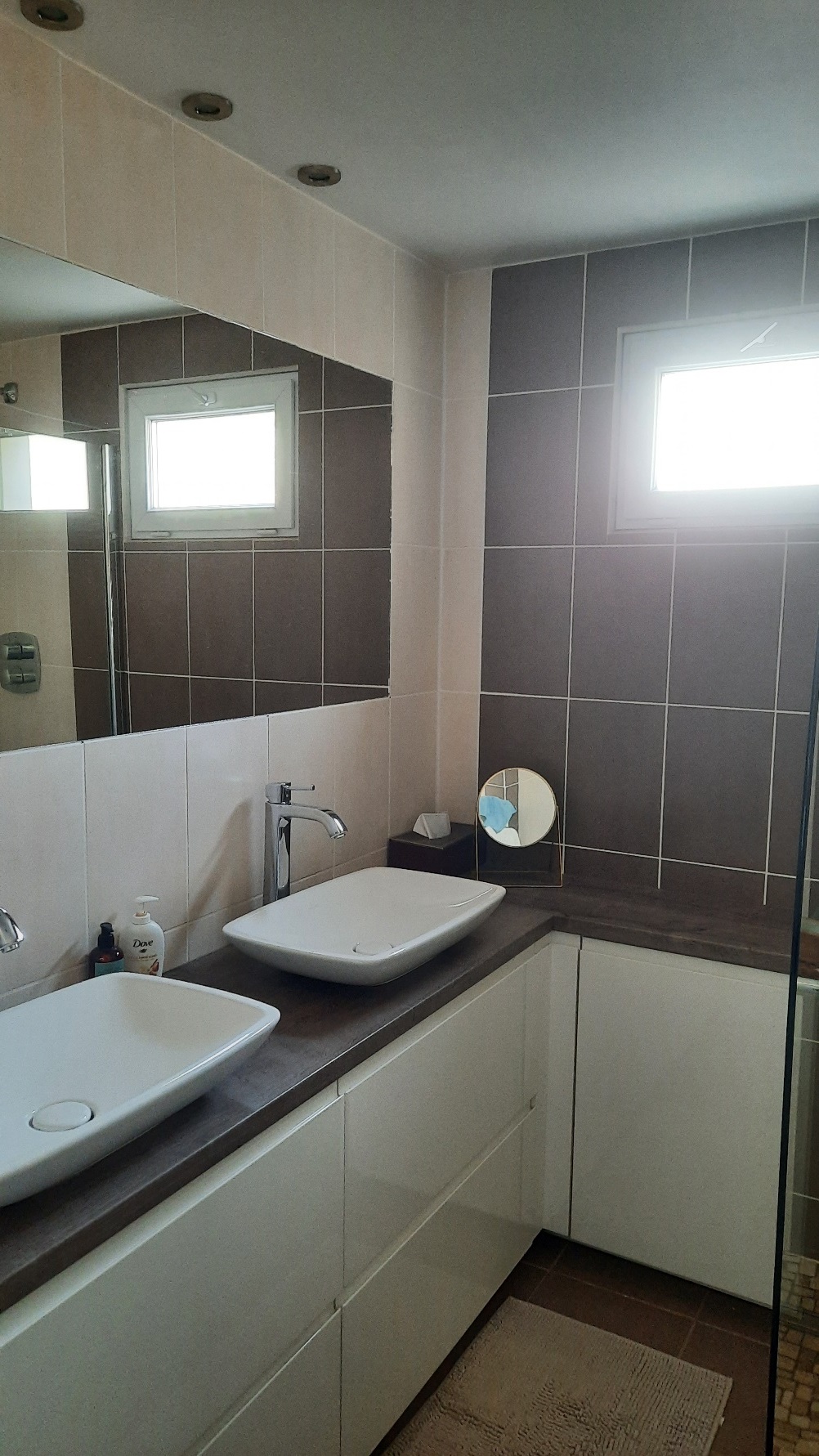 * salle d 'eau avec douche italienne spacieuse, meubles sur mesures et double vasque récente.
